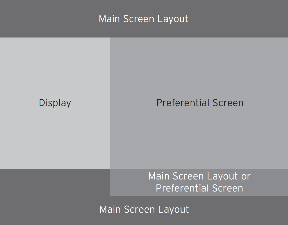 In the bottom part of the Screen Layout, there is a space that can be shared with the Preferential Screen, as illustrated by the graphic above. The bottom part of the screen layout allows up to 3 rows of buttons. If the third row of buttons is not used, the resulting free space will automatically be assigned to the preferential screen area. If the third row is used, the preferential screen area will simply squeeze in the smaller space, making every button slightly smaller.