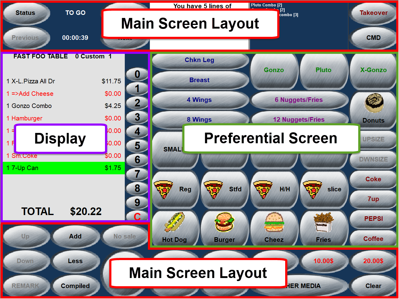 This is the area where most sales items will be displayed. Multiple screens can be created. Each screen will typically contain items that are related to each other. Navigation keys can be added to the screen layout to cycle through all available preferential screens. Clever preferential screen designs can also allow navigation from the preferential screens directly. This area will also display variable lists, item classes and weighted modifiers.