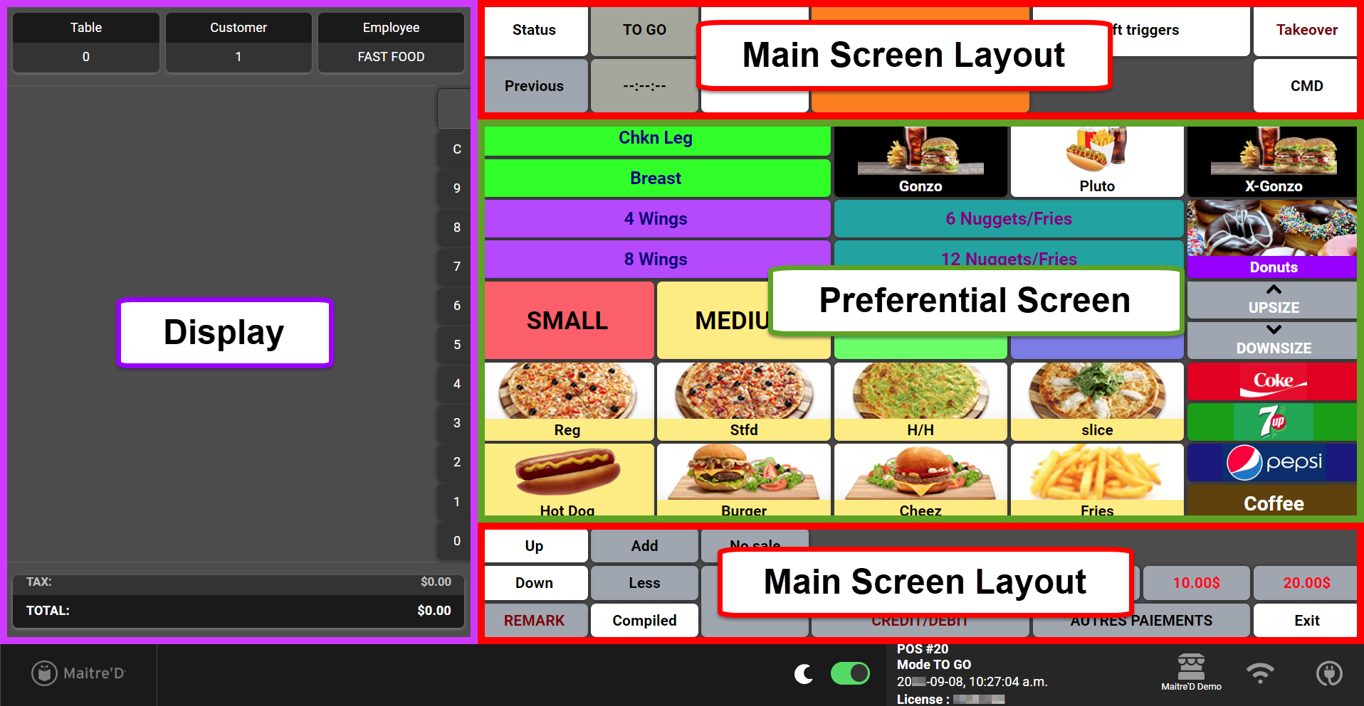 The Maitre'D POS screen has 3 main components: