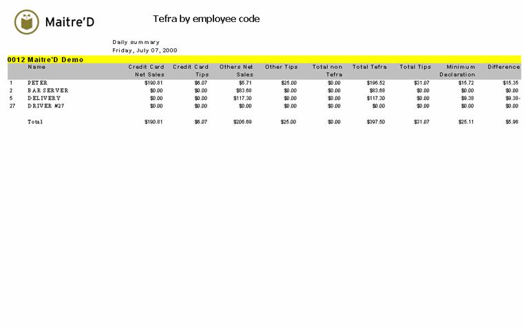 Maitre'D TEFRA by employee code report gives information regarding the credit card sales, credit card tips, other net sales and other tips for each employee. This report is used to ensure that employees are claiming the tips required by the law. This report is sorted by server code from the POS Control module and is available for a specific date or date range. Take note Maitre'D do not report employee under training.